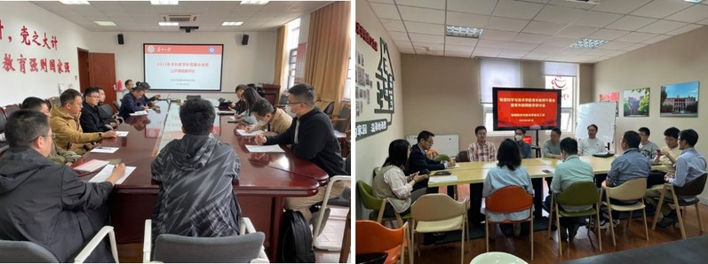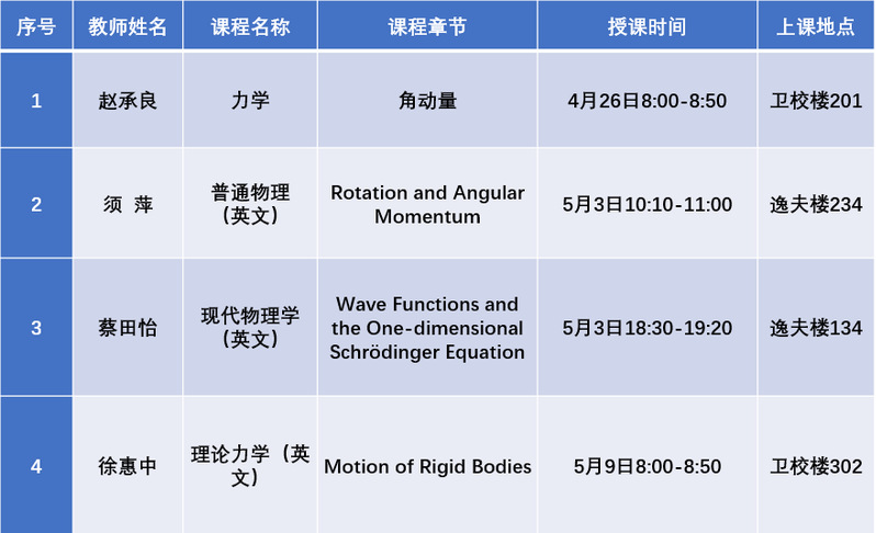 赵承良老师讲授“力学”示范课,回顾“天宫课堂”陀螺运动试验,介绍“心怀祖国、勇于创新、甘于奉献”的陀螺精神,引出教学主题“角动量”及“角动量守恒”,赵老师结合科普教育,通过润物细无声的方式有机融入思政内容,注重对学生思想价值的引领。须萍老师带来一堂生动的《普通物理》(英文)习题课,结合雨课堂信息化教学手段实现了实时互动,及时掌握课堂答题情况,帮助学生更好把握转动及角动量章节的重难点。蔡田怡、徐惠中老师分别讲授《现代物理学(英文)》与《理论力学(英文)》,结合演示实验,积极与学生互动,引导启发式授课。四位老师的课堂展示出了各自的特色和风采,起到了公开示范的重要作用,也成为学院推广优质课程的重要渠道。