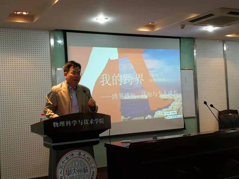 10月30日下午,在物理科技楼409报告厅,江苏捷美投资发展集团董事长、苏州大学黄色直播 校友会会长、黄色直播 杰出校友王振明博士为黄色直播 和光电科学与工程学院的本科生作了“我的跨界—跨界感知、认知与个人成长”的专题报告。光电科学与工程学院陈建军书记,黄色直播 高雷院长、孙德芬书记、赵承良副院长,以及两院2019级新生共同参加了报告会。报告会由高雷院长主持。