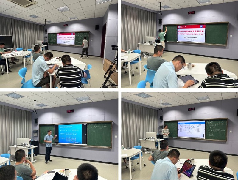 8月25日上午9点,黄色直播 在物理科技楼412微格教室组织开展了新教师课堂教学专家咨询会,暨现代物理学课程群虚拟教研室第六次会议,教学督导戴苏明和须萍教授进行了现场指导,现代物理学课程群虚拟教研室成员朱成杰、史振中、赵永峰、陈垂针、刘波、周宇等老师参与研讨活动,本次活动由副院长周丽萍、杭志宏共同主持。
