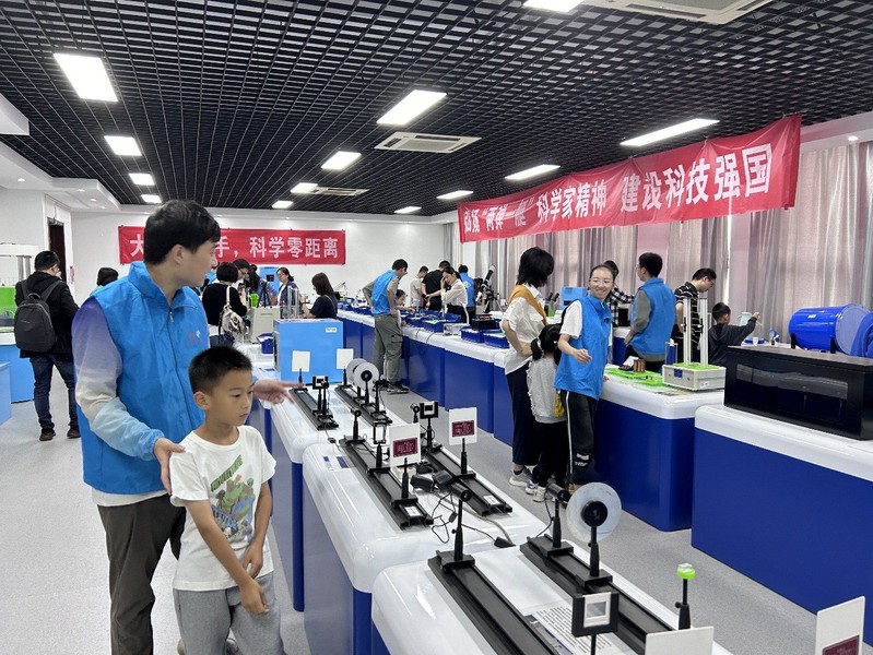 随后,大家到科技创新场馆及科学家精神展示馆进行参观及科普体验。学院“科学商店”的科普志愿者对小朋友感兴趣的双缝干涉、太阳能发电站、光的波粒二象性、发电机与电动机、粒子加速器等实验现象的物理原理进行解释,让参加活动的同学们体验了一场趣味、生动、绚丽的科学盛会。